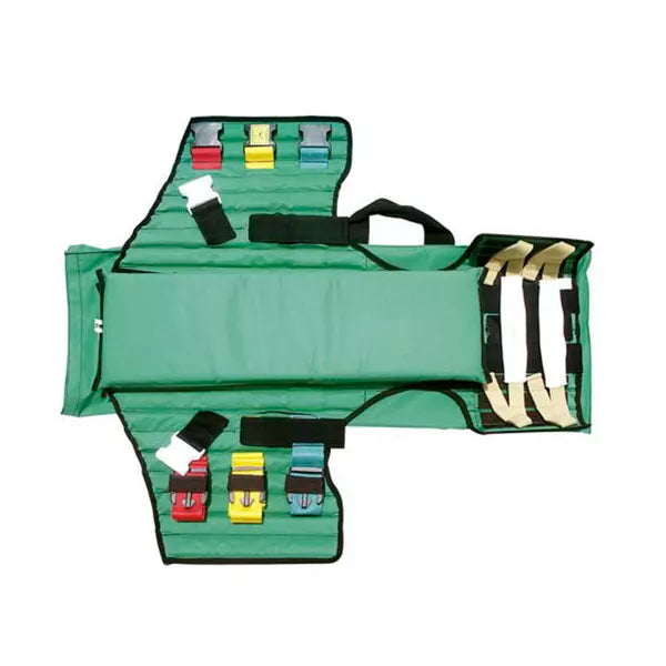 Colete de imobilização dorsal (ked) em nylon, oferece imobilização total, desde a cabeça até a região do cócix. Possui três tirantes em cores diferentes (verde, amarela e vermelha) para imobilização do tronco e dois tirantes pr...